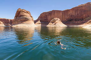 Lolo swimming amongst the reflectionsIt was so beautiful, I had to jump in and try to touch them. That’s what’s so nice about Lake Powell in summer. The water is a balmy 80 degrees, making it very easy just to dip in and out all day.